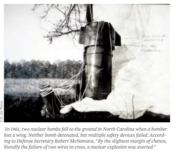 In 1980, an engine on a B-52 bomber at the Grand Forks Air Force Base in North Dakota caught fire. The blaze lasted three hours despite efforts by firefighters, and the main factor that kept the flames away from nearby armed SRAMs (Short-Range Attack Missiles with nuclear warheads) was the wind.