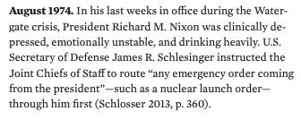 Pelopidas lays out what I consider to be the most terrifying nuclear paradox. In practice, proponents of nuclear deterrence do not have full and consistent trust in the leader (president, chancellor, etc.) to make the right decisions. What they trust is the rationality of the chain of command in the aggregate. They believe that in the face of a “crazy,” illegal, or illegitimate order, “someone down the chain of command will recognize it for what it is and will disobey.”